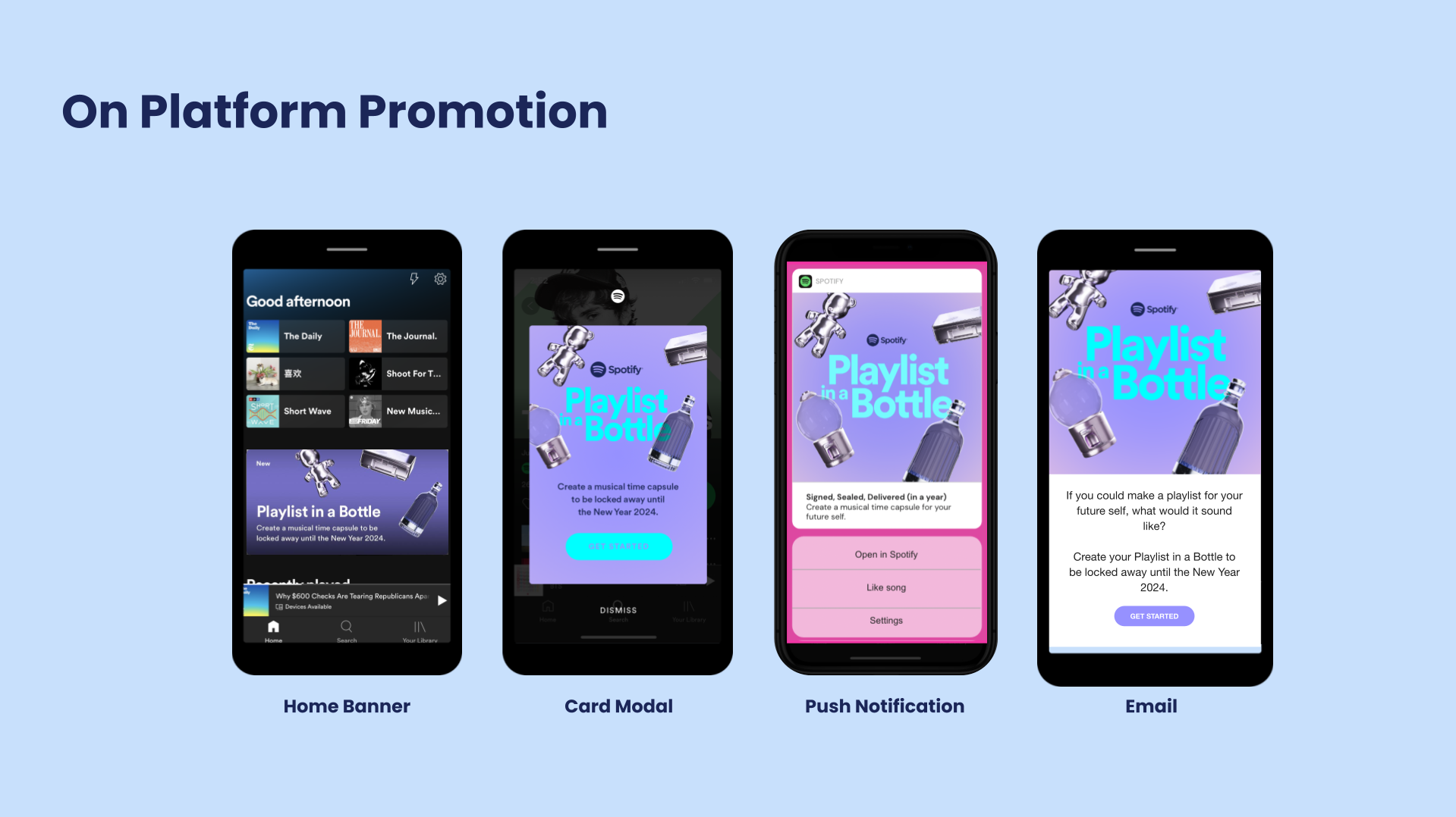 Our playlists help us freeze moments in time— with songs that become our anthems for breakups, makeups, and all the pivotal moments that define who we are. Spotify’s Playlist in a Bottle takes users on an immersive journey in describing who they are in the present moment through music. Users answered questions and prompts about themselves with a song and seal them in a “bottle,” creating a musical time capsule locked away until 2024.